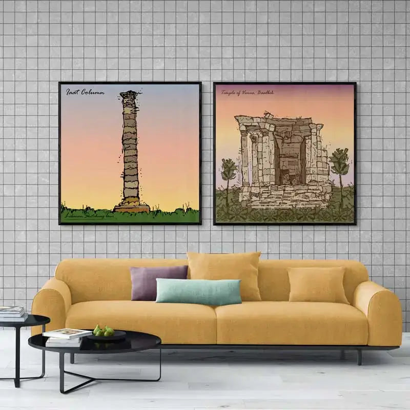 This collection celebrates the timeless beauty ofΒ Lebanonβs ancient past and layered civilizations, sketched by hand, colored with care, and filled with stories carved in stone. From Roman ruins to Phoenician traces, every piece in this series is a visual echo of where we come from.